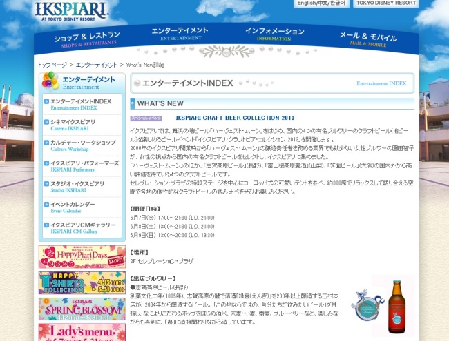 舞浜の地ビール「ハーヴェスト・ムーン」をはじめ、国内の4つの有名ブルワリーのクラフトビールを楽しめる「イクスピアリ・クラフトビア・コレクション 2013」を開催します!