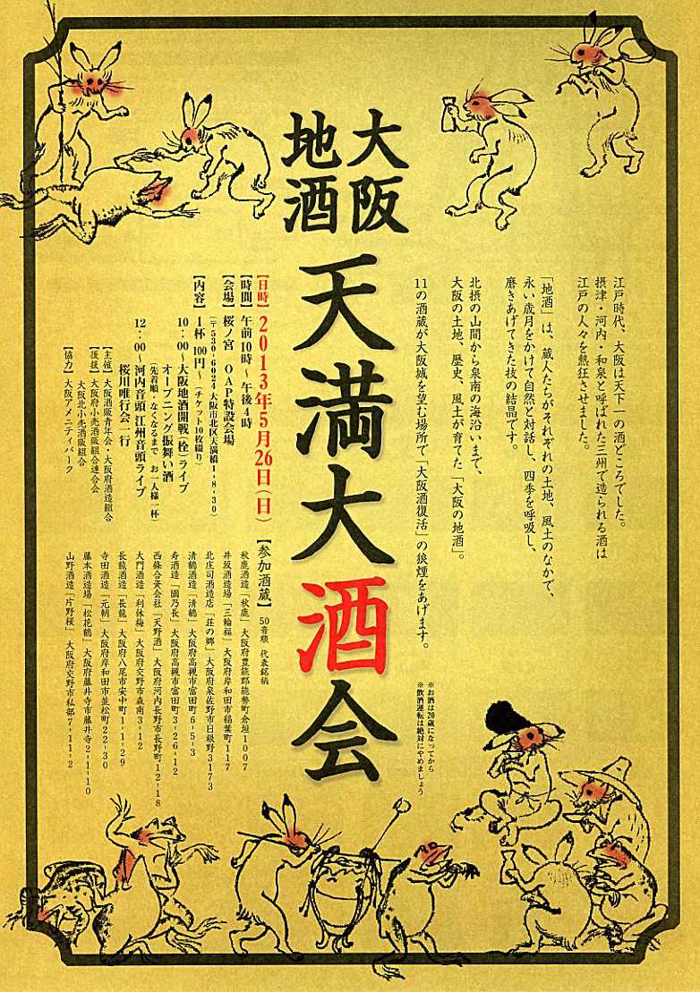 2013年 5月 26日 2013年 5月 26日 1000 100 個別注文形式 http://www.japansake.or.jp/app/events/183?area=0 大阪市北区天満1-8-8 桜ノ宮OAP 特設会場 06-4792-8533 北摂の山間から泉南の海沿いまで、「大阪の地酒」11の酒蔵が集結! 【開催時間】 10:00~16:00 【参加蔵元】 秋鹿、三輪福、荘の郷、清鶴、国乃長、天野酒、利休梅、長龍、元朝、松花鶴、片野桜の11蔵元 【主催】 大阪酒販青年会、大阪府酒造組合 category_event 近畿 イベント情報
