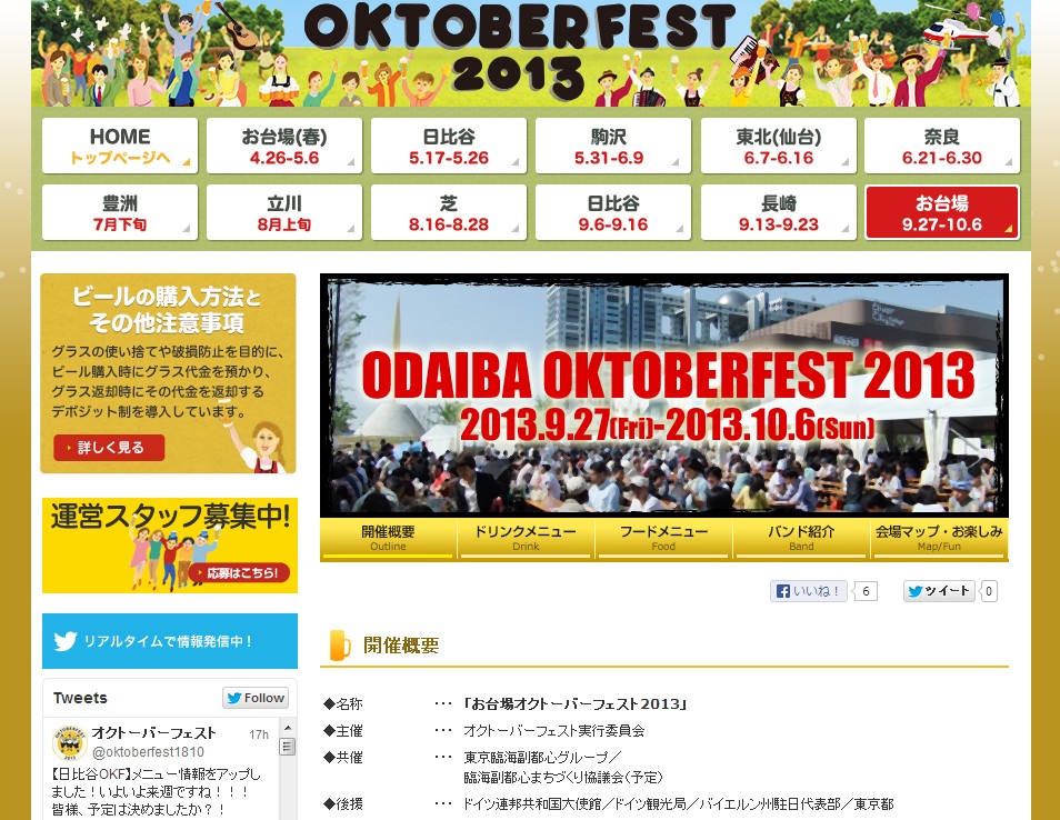 2013年 9月 27日 2013年 10月 6日 個別注文形式 http://oktober-fest.jp/2013odaiba/index.html シンボルプロムナード公園 セントラル広場 平日16:00~22:00 土日11:00~22:00 (L.O. 21:30) ※雨天時も開催 (荒天の場合、中止する場合があります) category_event 関東 イベント情報