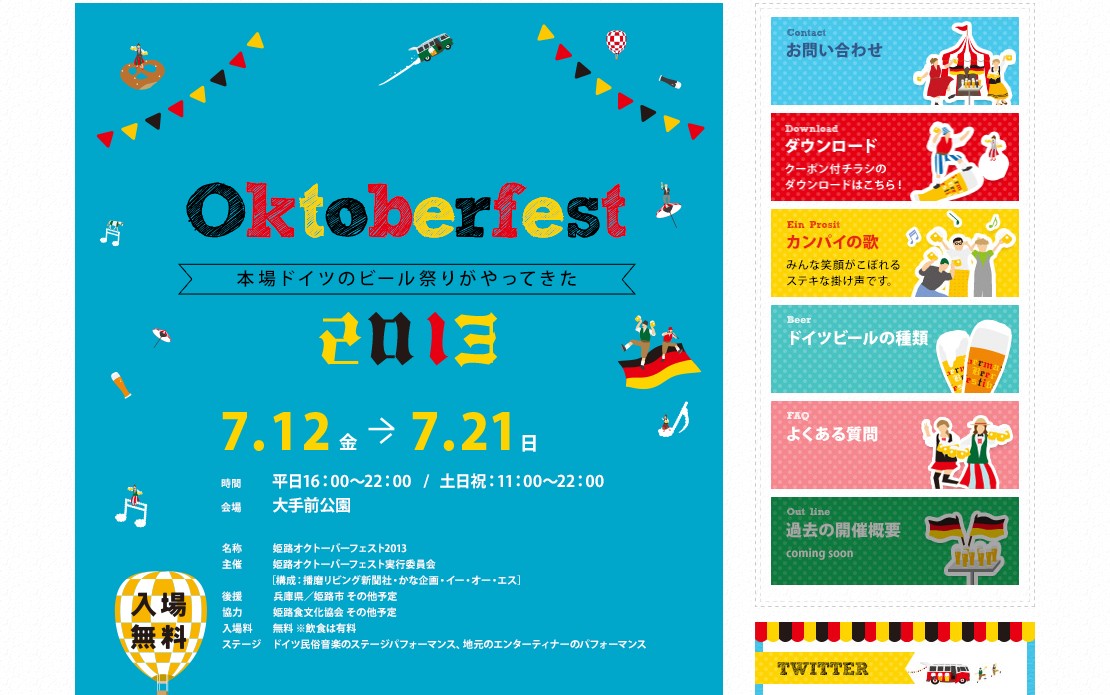 2013年 7月 12日 2013年 7月 21日 個別注文形式 http://oktfest.jp.net/himeji/ 大手前公園 079-224-0755 本場ドイツのビール祭りがやってきた!入場は無料です! 平日16:00~22:00 土日祝 11:00~22:00 category_event 近畿 イベント情報