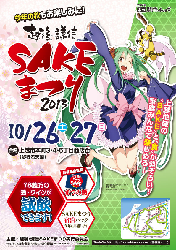 2013年 10月 26日 2013年 10月 27日 飲み放題形式 http://kenshinsake.com/ 新潟県上越市 本町3・4・5丁目商店街 本町3・4・5丁目商店街で開催します! 18蔵元の酒・ワインが試飲できます。 数量限定の「まつり酒」販売や、SAKE祭り宿泊パックも開催します! category_event 中部 イベント情報