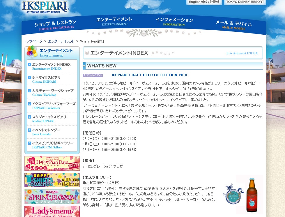 舞浜の地ビール「ハーヴェスト・ムーン」をはじめ、国内の4つの有名ブルワリーのクラフトビールを楽しめる「イクスピアリ・クラフトビア・コレクション 2013」を開催します!