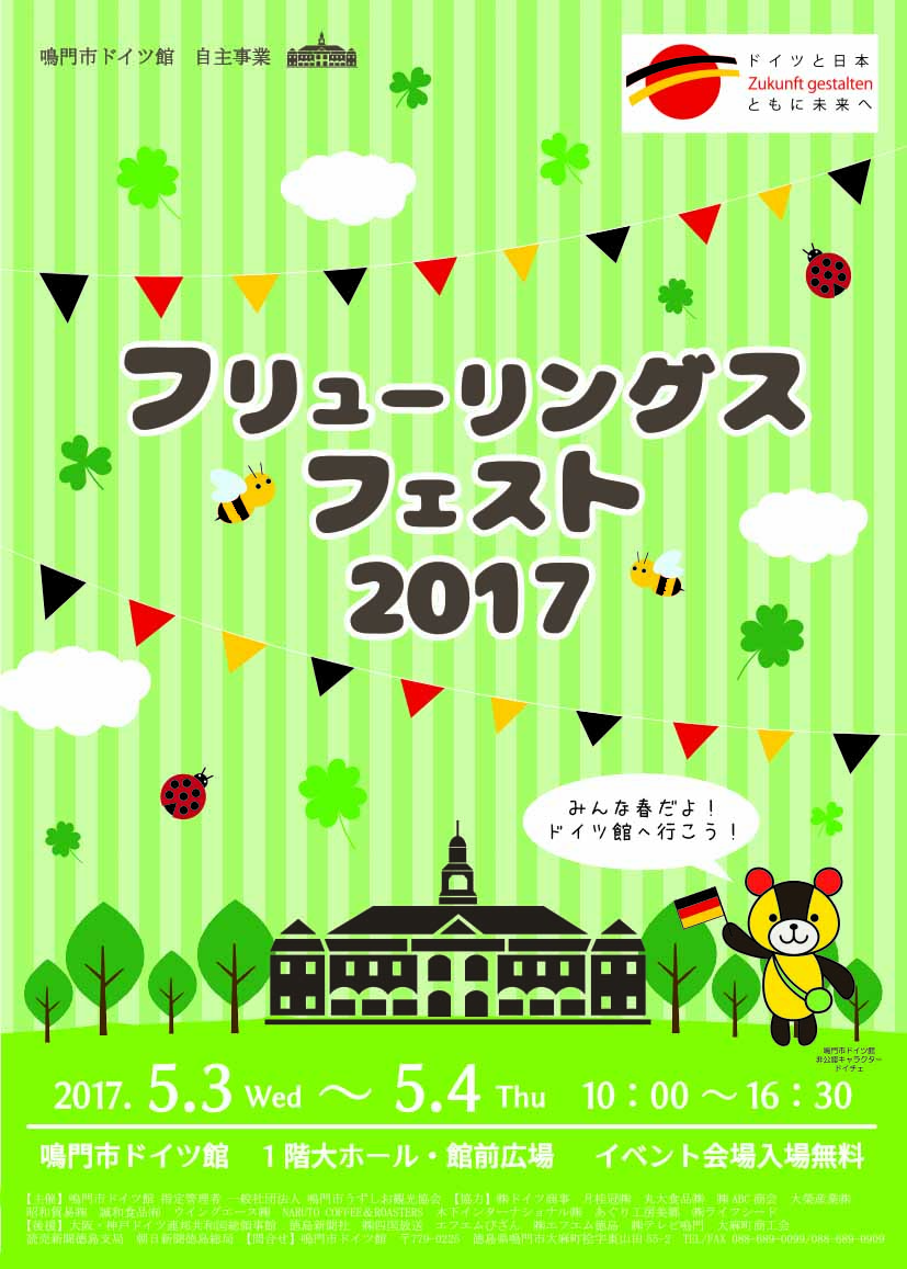 2017年 5月 3日 2017年 5月 4日 0円 個別注文形式 http://doitsukan.com/info/?action_news_view_detail=true&news_id=32&filter= 鳴門市ドイツ館 1階大ホール 088-689-0099 フリューリングスフェストは、ドイツ語で「春を祝う祭り」という意味です。 当日は、ワイン、ビールはもちろん、菓子、パン、ソーセージ、雑貨なども販売されます。 日時 2017年5月3日(水・祝)~5月4日(木・祝) 10:00~16:30 category_event 中四国 イベント情報