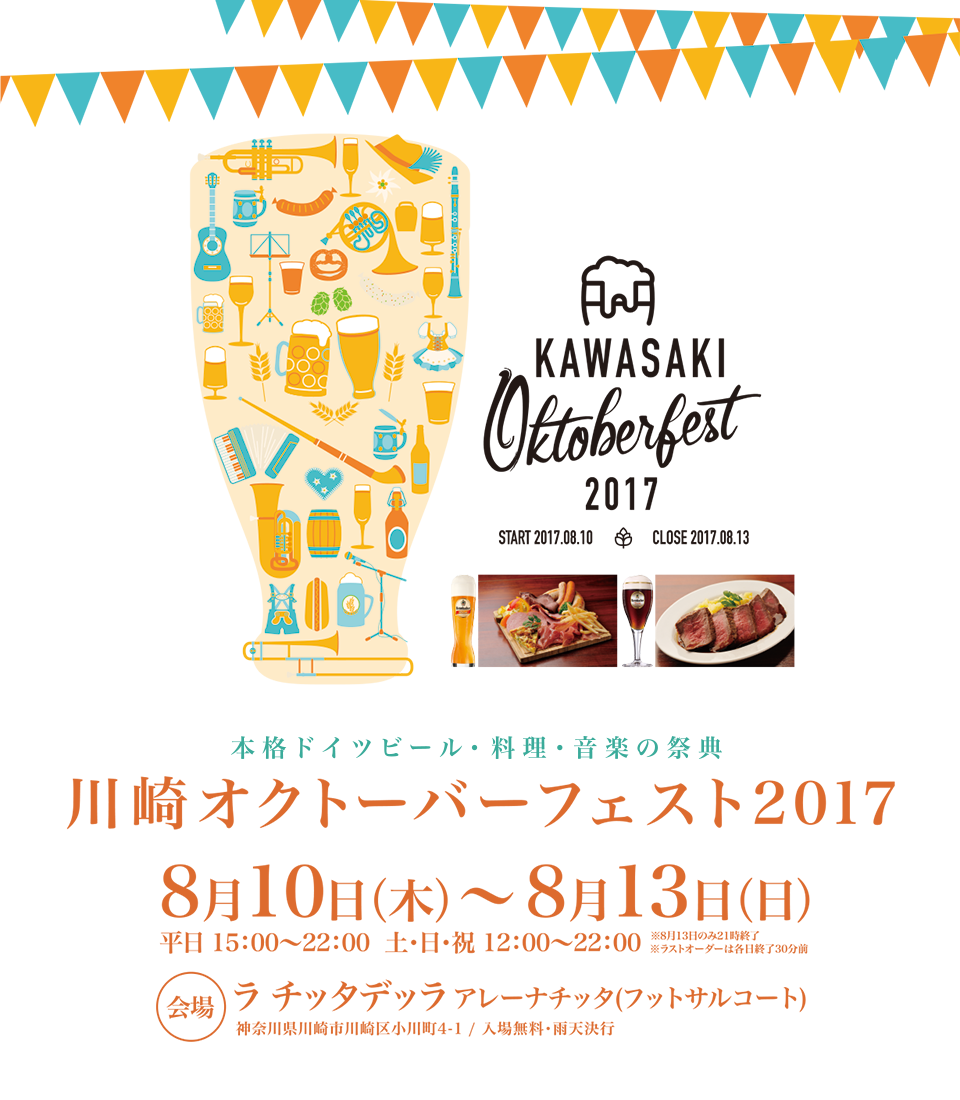 2017年 8月 10日 2017年 8月 13日 800円 個別注文形式 http://okt-fest.com/kawasaki/ ラ チッタデッラ アレーナチッタ(フットサルコート) 本格ドイツビールと、料理が楽しめます。 日時 2017年8月10日~8月13日 平日 15:00~22:00 土日祝 12:00~22;00 8月13日のみ21:00終了 料金 ドイツビール 1000円~ ドイツフード 800円~ category_event 関東 イベント情報
