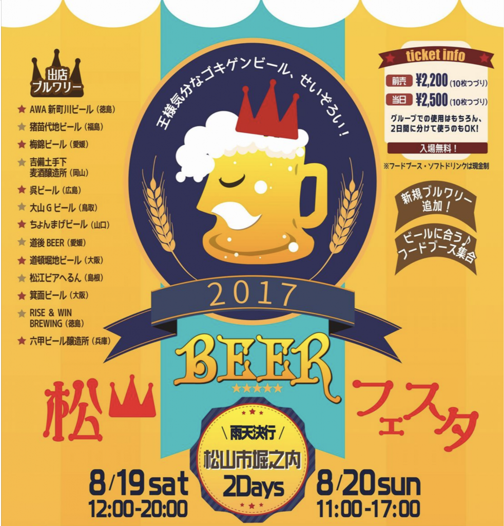 2017年 8月 19日 2017年 8月 20日 2200 2500 個別注文形式 https://www.facebook.com/matsuyama.beer/ 松山市城山公園内 堀之内管理広場 日時 2017年 8月19日(土)・8月20日(日) 19日 12:00~20:00|20日 11:00~17:00 料金 入場料:無料 ビールチケット(10枚綴り) 前売 2,200円 / 当日 2,500円 ※ ビールはチケット制・フードその他は現金制 category_event 中四国 イベント情報
