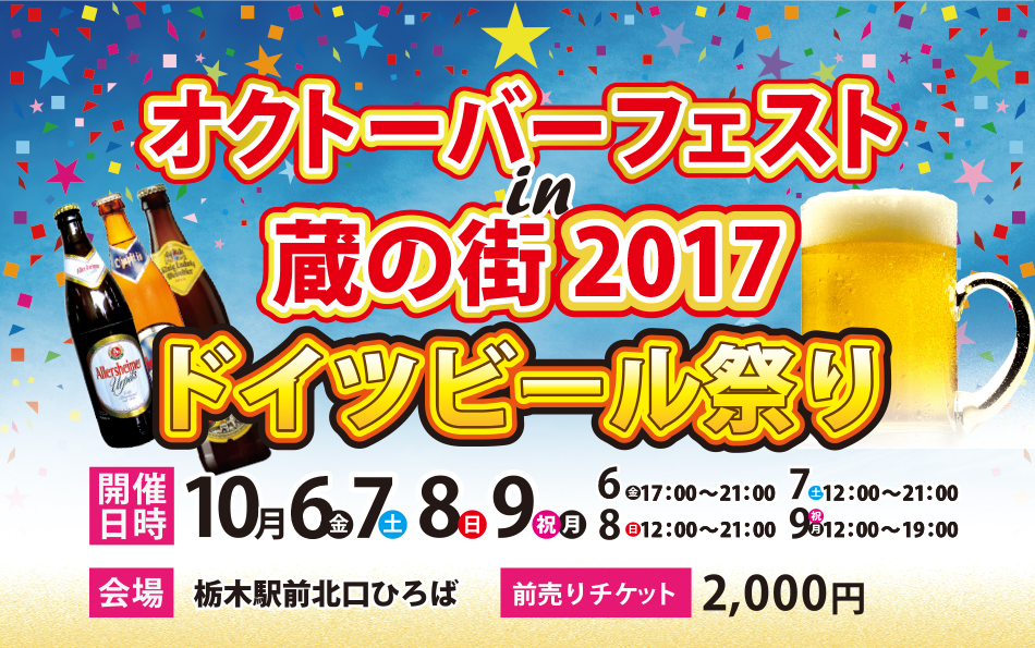 2017年 10月 6日 2017年 10月 9日 2000 個別注文形式 http://www.beerfes-tochigi.com/ 栃木駅前北口ひろば 日時 2017年10月6日 17:00~21:00 10月7日 12:00~21:00 10月8日 12:00~21:00 10月9日 12:00~19:00 料金 前売りチケット 2,000円 1,200円のドイツビール引換券+1,000円の食のチケット category_event 関東 イベント情報