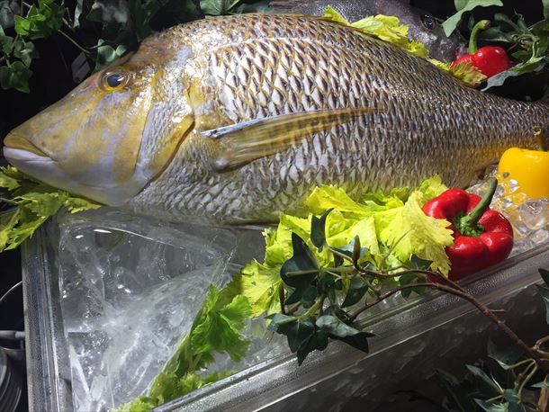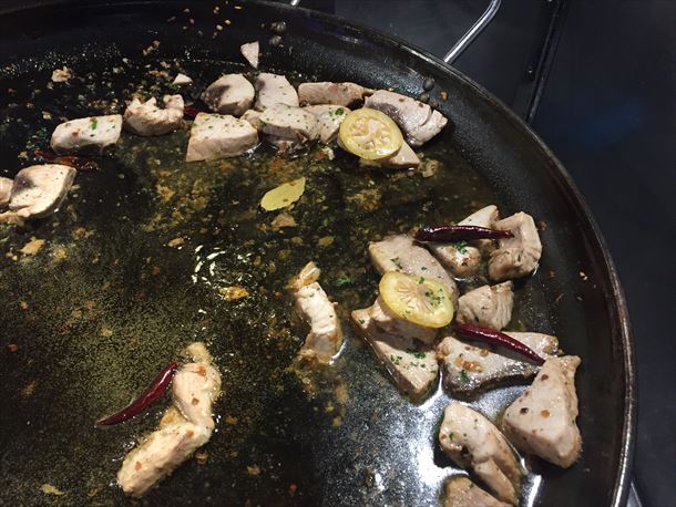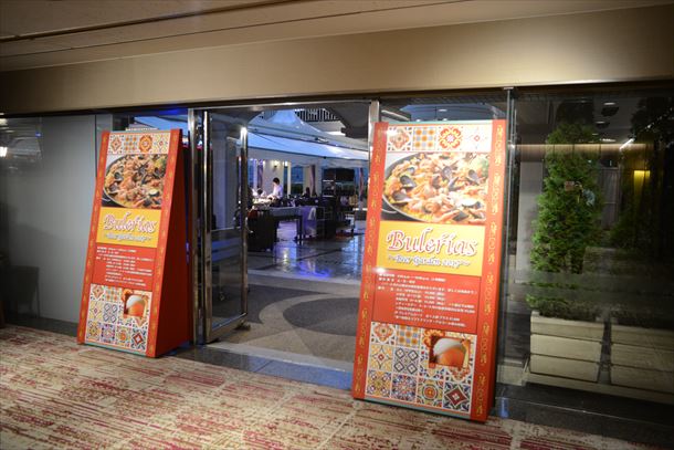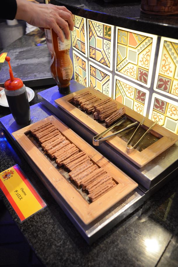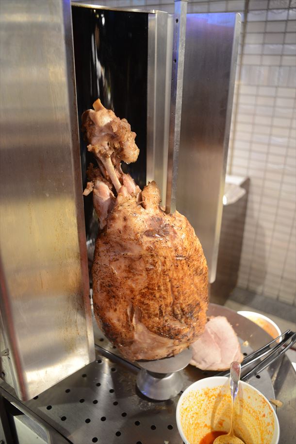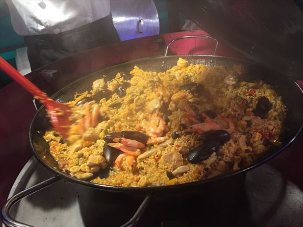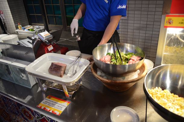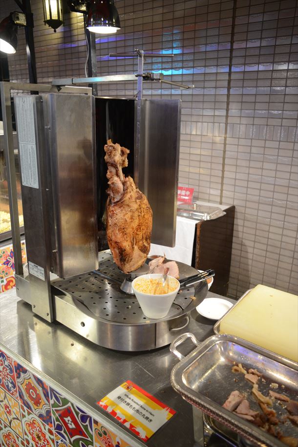ライブキッチンにはパエリヤ、アヒージョ、豚もも肉の丸焼きなどをスタッフさんが取り分けてくれます。
