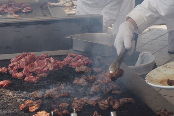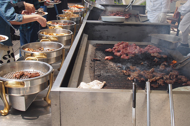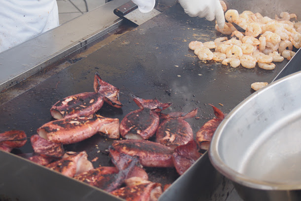 目の前でコックさんがジュージューと焼いてくれます。おいしそうな香りと煙がたまりません!