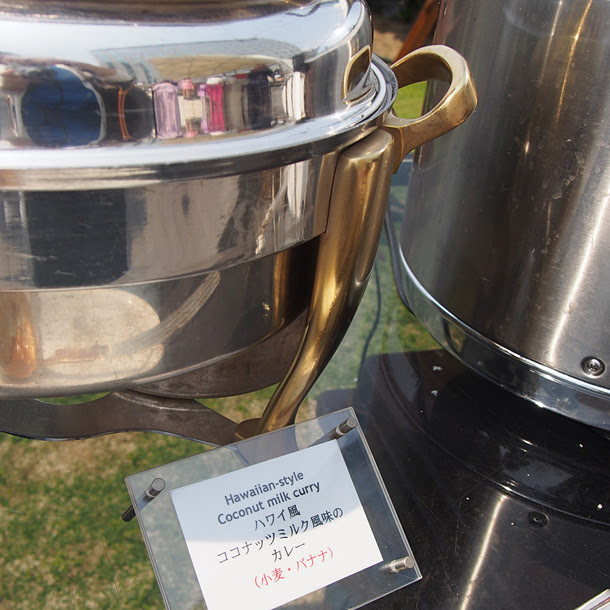 ハワイ風ココナッツミルク風味カレーやスープ、ごはん、パンもありました。