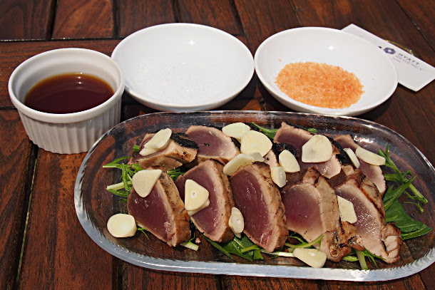 鰹の塩タタキ 2種類のハワイアンソルト(シーソルトとアラエアシーソルト)と共に