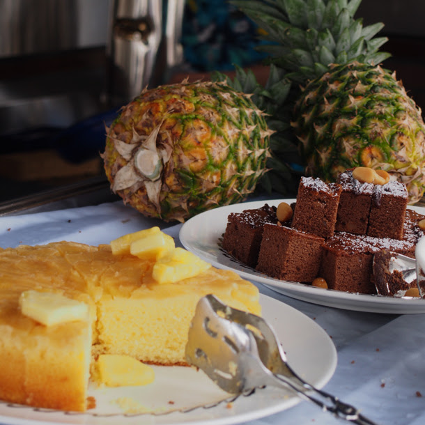 パンケーキ、プディング、ココナッツ入りチョコレートケーキ、パイナップルのアップサイドダウン、キャラメルタルト、ハワイのデザート・ハウピアなどなど。